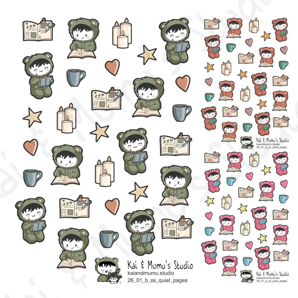 Use these journaling stickers when you want to write, plan, or reflect. Each design adds focus and flow, helping you mark writing sessions, ideas, or quiet times. The sheet fits easily in most planners, dairies, and bullet journals. In addition, it pairs beautifully with other Kai & Mumu designs, creating harmony across your pages.